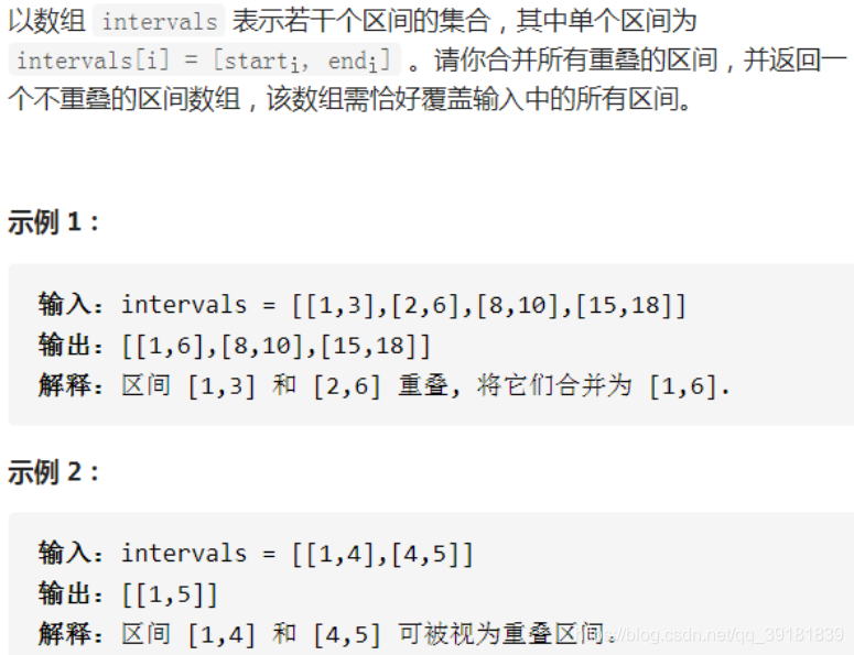 与上一题的区别在于要合并重叠的区间,还是从intervals的第一个元素开始遍历,最开始比较的对象为intervals[0][1],在遍历过程中不断更新,此对象的含义为上一个区间的末尾。即新的区间的开头比上一区间的末尾大,就不需要合并。