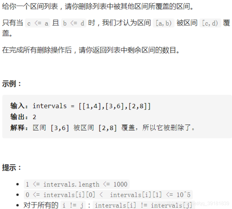class Solution { public int removeCoveredIntervals(int[][] intervals) { if(intervals.length == 1) return 1; Arrays.sort(intervals, (v1, v2) -> v1[0] == v2[0] ? v2[1] - v1[1] : v1[0] - v2[0]); int res = intervals.length; int r = intervals[0][1]; for(int i = 1; i < intervals.length; i++){ if(intervals[i][1] <= r){ res--; } else r = Math.max(r, intervals[i][1]); } return res; } }