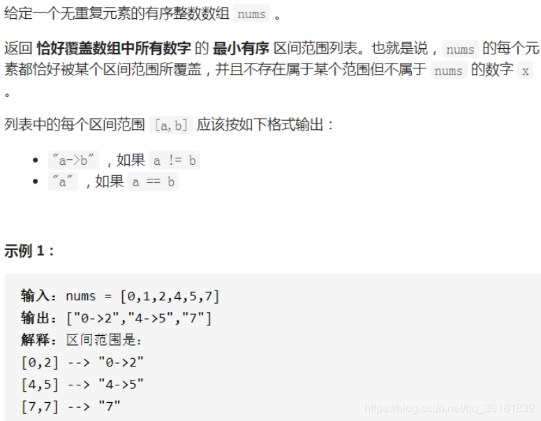 class Solution { public List<String> summaryRanges(int[] nums) { List<String> res = new ArrayList<>(); if(nums.length == 0) return res; if(nums.length == 1){ res.add(String.valueOf(nums[0])); return res; } int i = 0; for(int j = 0; j < nums.length; j++){ if(j == nums.length - 1 || nums[j] + 1 != nums[j + 1]){ String tmp = String.valueOf(nums[i]) + "->" + String.valueOf(nums[j]); if(nums[i] != nums[j]) res.add(tmp); else res.add(String.valueOf(nums[j])); i = j + 1; } } return res; } }