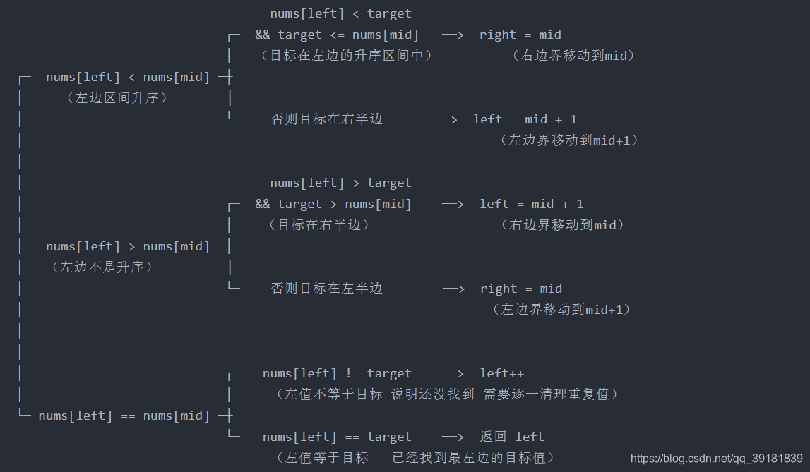 在二分查找过程中通过 mid 将数组分割为两部分,[l, mid] 和 [mid+1, r],通过比较大小可确定哪部分是有序的。确定nums[mid]在左部分还是右部分,再确定target在mid的左边还是右边,从而调整left和right。